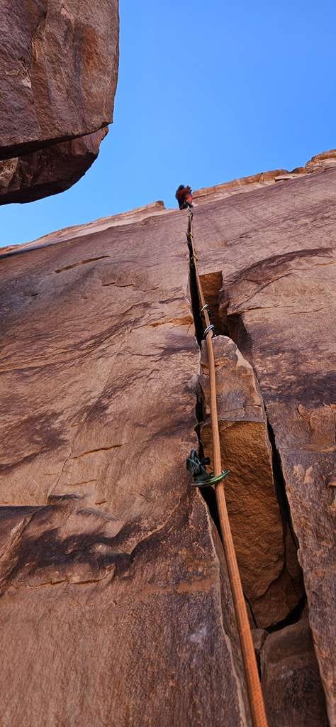 Greetings everyone, from a splitter hand crack in the warm-wintering Moab, where, although it is February, we are looking for shade to climb!