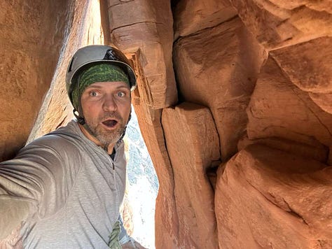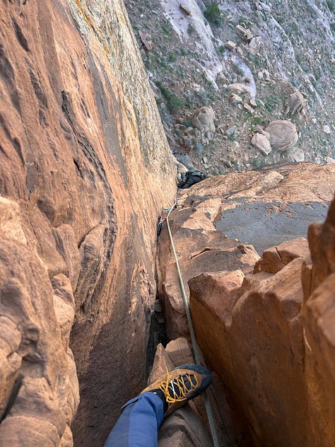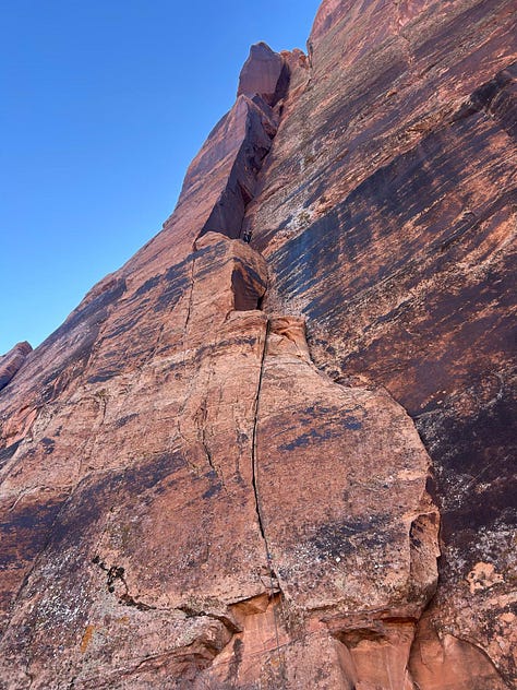 Moab’s already feeling like early summer, and we’ve been chasing shade like it’s June, sneaking in climbs on cool mornings. We got on Sorcerer’s Apprentice (right side)—a proper little Navajo sandstone adventure with some magic spice!